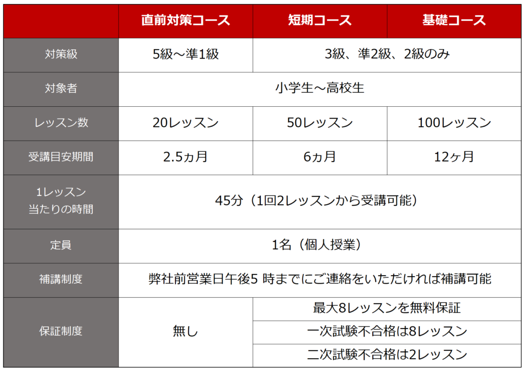 熟練講師による完全担任制のマンツーマンレッスンです。 準1級から5級まで、6つの級に幅広く対応しています。